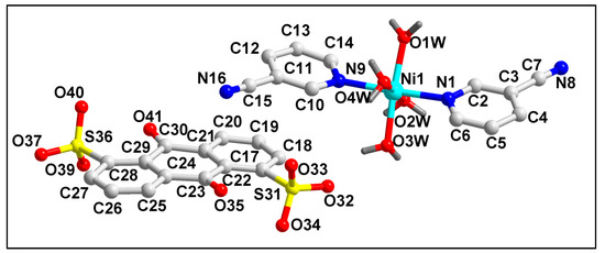 Firstly, Ni(CH3COO)2·4H2O (0.248 g, 1 mmol) and 3-CNpy (0.208 g, 2 mmol) were mixed in 10 mL of de-ionized water and stirred mechanically at room temperature for two hours. Then, 0.412 g of Na2-ADS (1 mmol) was added to the reaction mixture with continuous stirring for another hour (Scheme 1). Then, the resulting solution was kept unperturbed for slow evaporation in cooling conditions (2–4 °C) for crystallization. After a few weeks, blue block shaped single crystals suitable for X-ray crystallographic analyses were obtained. The yield was 0.641 (84%). The anal. Calcd. For C26H27.5N4NiO14.75S2 was as follows: C, 41.12%; H, 3.72%; N, 7.38%.The found percentages were C, 41.02%; H, 3.60%; N, 7.32%. The IR spectral data (KBr disc, cm−1) were as follows: 3426(br), 2240(s), 1692(s), 1603(s), 1577(s), 1481(m), 1418(s), 1315(s), 1271(s), 1207(s), 1042(s), 971(s), 824(s), 729(s), 614(s) (s, strong; m, medium; w, weak; br, broad; sh, shoulder).