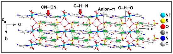 The coordinated 3-CNpy and uncoordinated ADS ligands of compound 1 are involved in the formation of the π-stacked ternary assembly (Figure 2a). The phenyl and pyridine rings of ADS and 3-CNpy are involved in (π-π)1, (π-π)2 and (π-π)3 interactions having centroid(C17–C22)–centroid(N1, C2–C6), centroid(N1, C2–C6)–centroid(C26–C29, C23, C24) and centroid(C26–C29, C23, C24)–centroid(N9, C10–C14) separations of 3.96, 3.88 and 3.99 Å, respectively. The slipped angles (angle between the ring normal and the vector joining the ring centroids) were found to be 20.7, 20.7 and 20.6°, respectively [73]. Moreover, O–H∙∙∙O hydrogen bonding interactions were also observed involving the coordinated water molecules (O1W–H1WA∙∙∙O33 = 1.90 Å; O2W–H2WB∙∙∙O33 = 1.83 Å; O3W–H3WA∙∙∙O37 = 1.93 Å; O4W–H4WB∙∙∙O40 = 2.40 Å). A closer look also reveals the presence of two different types of anion–π, viz. anion–π(arene) and anion–π(CN), interactions in the compound involving the π electrons of the aromatic ring and –CN fragments of the 3-CNpy, respectively (Figure 2b).