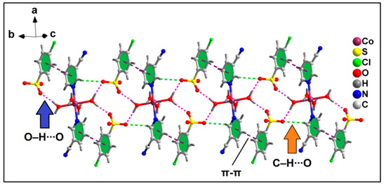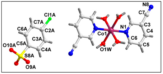 The molecular structure of compound 2 is depicted in Figure 4. Selected bond lengths and bond angles around the Co(II) center are summarized in Table S1. Compound 2 crystallizes in a monoclinic crystal system with space group C2/m. In compound 2, the Co(II) center is hexa-coordinated with two 3-CNpy ligands, along with four coordinated water molecules. The di-cationic charge of the cationic complex is neutralized by the two uncoordinated 4-ClbzSO3 anions in the crystal lattice. The coordination geometry around the Co(II) center is an ideal octahedron where the nitrogen atoms (N1, N1′) of 3-CNpy occupy the axial sites, and the water molecules are present at the equatorial positions with zero r.m.s. deviation. Crystal structure analysis reveals the presence of a two-fold axis of symmetry in the crystal structure, with the axis passing through the Co(II) center. The Co–N and Co–O bond lengths are well consistent with the previously reported Co(II) compounds [74,75,76,77].