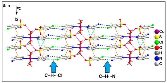 The neighboring 1D chains of compound 2 are interconnected via C–H∙∙∙N and C–H∙∙∙Cl hydrogen bonding interactions to form the layered assembly along the crystallographic ab plane (Figure 6). C–H∙∙∙N hydrogen bonding interactions are observed in the layered assembly involving the N atom of the –CN moiety of 3-CNpy, which has a C5–H5∙∙∙N8 distance of 2.64 Å. Moreover, C–H∙∙∙O hydrogen bonding interactions are also observed involving the O atom of 4-ClbzSO3, with a C7A–H7A∙∙∙O9A distance of 2.92 Å.