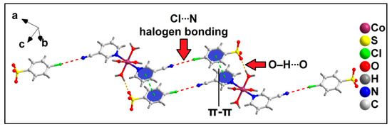 Non-covalent interactions are pivotal and constructive in metal–organic chemistry, crystal engineering and molecular biology, as well as in other domains of synthetic chemistry [40,41]. Numerous endeavors have been devoted to visualizing and quantifying the non-covalent synthons observed within supramolecular architectures due to their capacity to guide structures [42,43]. Non-covalent interactions, although inherently weaker than coordinate covalent bonds, exert significant influence on the construction of coordination network architecture, owing to their multitude and directional characteristics [44]. The exploration of the cooperative interplay of intermolecular hydrogen bonding and aromatic π-stacking interactions has become a compelling subject of inquiry [45,46]; as such, cooperative interactions are remarkably important for the stability of bio-molecules [47]. Interactions involving the nitrile functional groups of organic ligands are pivotal for the stabilization of supramolecular assemblies, as highlighted in prior research [48,49]. Just as observed with the carbonyl functional group in metal–organic compounds, the nitrile group has the potential to exhibit local dipole moments [50]; thus, organic functional groups engaged in dipole–dipole interactions may also serve as hydrogen bond acceptors [51]. Furthermore, the exploration of halogen bonding contacts in metal–organic compounds, which has been less frequently acknowledged, reveals new avenues in crystal engineering [52,53,54,55]. Halogen bonding interactions, a subset of σ-hole interaction, possess equally important roles in the stabilization of supramolecular assemblies [56,57,58]. However, reports of “charge reverse” halogen bonding, where the electron acceptor halogen atom is located on the electron-rich fragment (anion) and the electron donor atom is on the electron-poor fragment (cation), are still scarce in the literature.