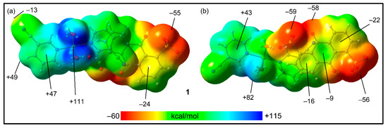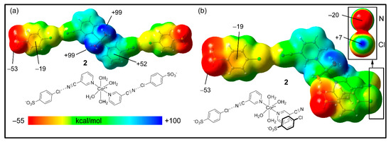 The MEP surfaces of compound 2 are shown in Figure 9 using two different trimeric assemblies (HaB, neutral systems). In the case of the planar assembly (Figure 9a), it can be observed that the MEP maximum is located at the H-atoms of the coordinated water molecules (+99 kcal/mol), and the minimum is located at the sulfonate groups (−53 kcal/mol), similar to compound 1. The MEP values over the 3-CNpy ring are large and positive; over the 4-ClbzSO3 ring, the value is negative (−19 kcal/mol).