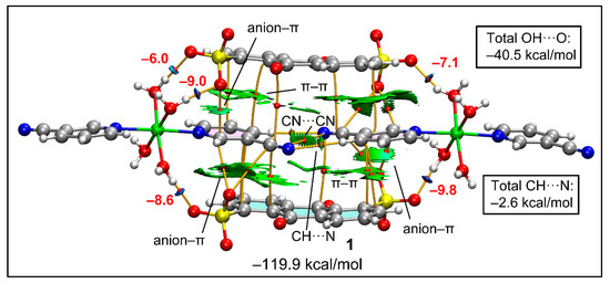 Figure 10 represents the QTAIM and NCI plot analyses combined to study the intricate combination of contacts that are formed in the double π-stacking assembly formed between two anionic and cationic moieties of compound 1. The very large formation energy (−119.9 kcal/mol) obtained is due to the strong electrostatic effects. The combined QTAIM/NCI plot study confirms the presence of strong H-bonds between the coordinated water molecules and the sulfonate groups, which are characterized by bond critical points (CPs, red spheres), bond paths (orange lines) and blue RDG isosurfaces. The study also confirms the presence of anion–π(arene) and anion–π(CN) interactions characterized by bond CPs, bond paths and green RDG isosurfaces located between the anion and the C-atoms of the arene or the cyano groups. The antiparallel CN···CN interaction is also confirmed by a bond CP, bond path and green isosurface located between both groups. We evaluated the contribution of the H-bonds using the Vr predictor and the equation proposed by Espinosa et al. [100], showing that the stabilization of the assembly due to these O–H···O H-bonds is −40.5 kcal/mol. This strong contribution confirms the relevance of these interactions in the X-ray packing. The C–H···N contacts are significantly weaker, with a total contribution of only −2.6 kcal/mol.