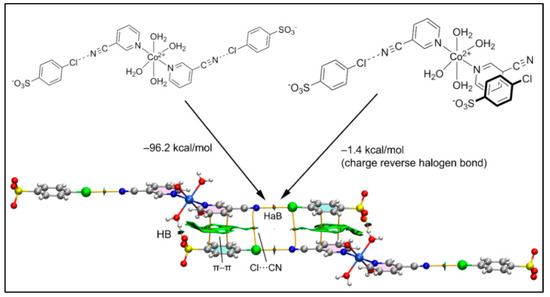 In order to investigate the existence of an σ-hole at the Cl-atom, we used the neutral trimer (HaB + π-stacked) shown in Figure 9b, where the anisotropy at the Cl-atom can be studied. Interestingly, in spite of the global negative charge of the 4-ClbzSO3, there is a modest σ-hole at the Cl-atom on the extension of the C–Cl bond (+7 kcal/mol), which can be appreciated in the amplification of the surface (top-right part of the figure) where the Cl and CN groups are stacked. For this representation, we used a different scale (≤–20 to +7 kcal/mol). In addition, the N-atom of the cyano group is negative in spite of the dicationic nature of the Co(II) complex. This MEP analysis confirms that the “charge reverse” halogen bonds are electrostatically favored.