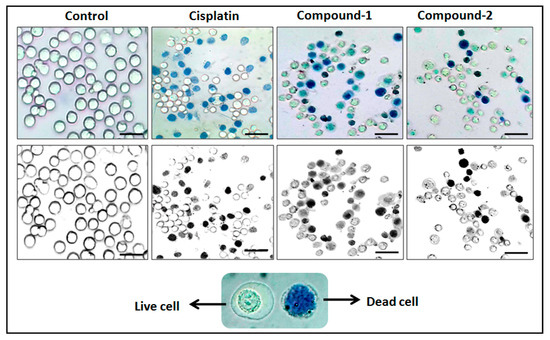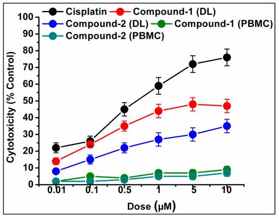 The trypan blue assay is based on the fact that living cells with intact cell membranes do not allow trypan blue dye to enter the cell membrane; in contrast, it can enter the damaged cell membrane of non-viable cells and stain as blue. As a result, when trypan blue dye is added to a treated cell culture, the non-viable cells appear as blue, and viable cells appear as clear/unstained [101]. In this study, the trypan blue assay revealed that the compounds are able to induce concentration dependent cytotoxicity in DL cells (Figure 12 and Figure 13), with nominal effects in normal healthy PBMC cells. Comparative analysis reveals that compound 1 induced higher cytotoxicity than that of compound 2 after 24 h of treatment. The findings obtained for the compounds were analyzed comparatively with the reference drug cisplatin [102], which shows higher cytotoxicity than the compounds. The half maximum inhibitory concentration (IC50), defined as the concentration required for 50% cell death in a cell culture, is often used to evaluate the cytotoxic potency of newly developed compounds/drugs. Figure 14 represents the dose response curves and the IC50 values for the compounds and cisplatin. Compound 1 exhibits a lower IC50 value (43 μM) as compared to compound 2 (78 μM) in the DL cell line after 24 h of treatment (Figure 14). The IC50 value of the reference drug, cisplatin, was found to be 0.63 μM in the same experimental setup.