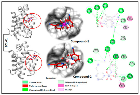 Molecular docking is a very useful approach in the discovery of drugs; it is useful for identifying and optimizing drug molecules, predicting the binding affinity and selectivity of the molecules, and designing new drugs with improved pharmacological properties [103]. The findings obtained from the trypan blue assay encouraged us to carry out a molecular docking study that considered BCL family proteins, viz. BCL-2 and BCL-XL. BCL-2 and BCL-XL have been significantly reported to play an active role in various stages of cancer progression and metastasis [104]. From our study, it was revealed that both compounds 1 and 2 possess strong binding affinities for BCL-2 and BCL-XL target proteins (Figure 15 and Figure 16). Compound 1 interacts with the BCL-2 receptor protein via four H-bonds, with active amino acid sites Tyr19, Lys20, Glu149 and Ser102. On the other hand, compound 2 also interacts with the BCL-2 receptor via four hydrogen bonds with Tyr19, Lys20 and Ser102. Moreover, compound 1 interacts with the BCL-XL receptor via seven hydrogen bonds with His177, Asn128, Glu124, Tyr173 and Trp169, whereas compound 2 interacts via five hydrogen bonds with Trp169, Tyr173, Glu124 and Asn128 residues. Therefore, the results suggest that both compounds have significant cytotoxicity inducing abilities due to their effective interactions with target receptors. Comparatively, compound 1 interacts more efficiently with the target proteins as compared to compound 2, which may be responsible for its higher cytotoxicity (Figure 17).