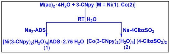 Compound 1 was isolated by reacting one equivalent of Ni(CH3COO)2·4H2O, two equivalents of 3-CNpy and one equivalent of Na2-ADS in water at room temperature. In a similar way, compound 2 was obtained by the reaction between one equivalent of Co(CH3COO)2·4H2O, two equivalents of 3-CNpy and two equivalents of Na-4-ClbzSO3 at room temperature in water. Compounds 1 and 2 are fairly soluble in water, and common organic solvents. Compounds 1 and 2 show room temperature (300 K) μeff values of 2.87 and 3.84 BM, respectively, suggesting the presence of two and three unpaired electrons per Ni(II) and Co(II) centers in the compounds, respectively [69].