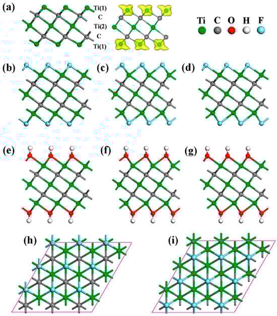 Optimized the free-standing Ti3C2 monolayer’s geometries and its fluorinated and hydroxylated structural forms: (a) a quintuple layer with Ti(1)-C-Ti(2)-C-Ti(1) stacking modes is shown in side views (left), and the bare Ti3C2 monolayer is generated by the computed spin density distribution (middle); side views of (b) I-Ti3C2F2, (c) II-Ti3C2F2, (d) III-Ti3C2F2, (e) I-Ti3C2(OH)2, (f) II-Ti3C2(OH)2, and (g) III-Ti3C2(OH)2; (h,i) the top views of I-Ti3C2F2 and II-Ti3C2F2. Reproduced with permission [32]. Copyright 2012, American Chemical Society.