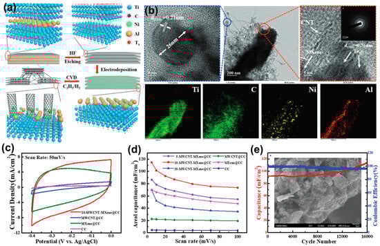 CNTs are a typical one-dimensional carbon substance with wide application potential in the sphere of energy storage because of their distinctive morphology and prime electrochemical characteristics. They are incorporated into the electrodes of supercapacitors as active materials and carriers. Min Jae Ko et al. [100] uniformly electrodeposited a nickel-aluminum layered double hydroxide (Ni-Al-LDH) catalyst on MXene particles to ensure the uniform growth of multi-walled carbon nanotubes (MWCNTs). Subsequently, these catalytic MXene particles were likely altered using low-pressure chemical vapor deposition (CVD) at a temperature of 700 °C in argon flow. On the one hand, the grown MWCNTs act as spacers to prevent the MXene films from stacking again; on the other hand, they act as charge collectors within and between particles (Figure 4a,b). Additionally, their three-dimensional interconnected structure efficaciously enhances the stability of the combined electrode both mechanically and physicochemically. As shown in the CV curve in Figure 4c, due to the high charge transfer rate of MWCNTs and the high activity of MXene, 10-MWCNT-MXene@CC exhibits a larger CV curve area. An electrode prepared from this material demonstrated an excellent areal specific capacitance of 114.58 mF cm−2 at a scan rate of 5 mV s−1, as depicted in Figure 4d, along with an excellent cycling stability of 16,000 cycles (Figure 4e).
