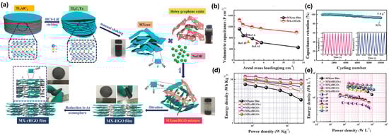 (a) demonstration of a combination of the qualified MXene/holey graphene film. (b) The outcome of areal mass loading on the volumetric capacitance of MXene film and MX-rHGO3 compared to several former reports. (c) Capacitance retention of MX-rHGO3-based symmetric supercapacitor on the condition of a density of electricity of 5 A g−1 for 10,000 cycles, unchanging electricity charge-discharge curve graphs of the original ten cycles and last ten cycles are displayed in the inset. (d) Gravimetric and (e) MX-rHGO3-based symmetric supercapacitors’ volumetric energy and watt densities compared to former reports. Reproduced with permission [99]. Copyright 2018, John Wiley and Sons.