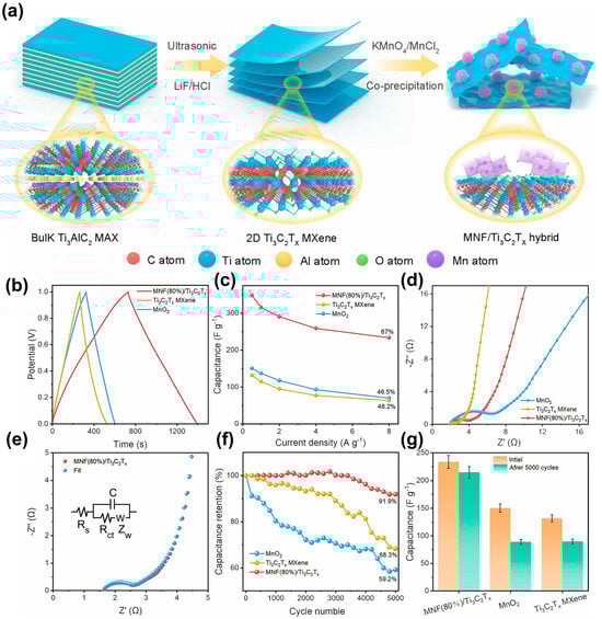 (a) Diagrammatic representation for the combination of the MNF/Ti3C2Tx nanoarchitectures. (b) GCD curve graphs of the MNF(80%)/Ti3C2Tx, MnO2, and Ti3C2Tx electrodes with an electricity density at 0.5 A g−1. (c) Difference of the specific capacitance when electricity density is MNF(80%)/Ti3C2Tx, MnO2, and Ti3C2Tx electrodes. (d) AC impedance spectra of the MNF(80%)/Ti3C2Tx, MnO2, and Ti3C2Tx electrodes and (e) the consistent fitting curve. (f,g) Cycling stability of the MNF(80%)/Ti3C2Tx, MnO2 and Ti3C2Tx electrodes. Reproduced with permission [105]. Copyright 2023, Elsevier.