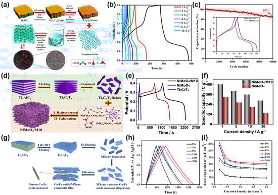 Figure 7a illustrates the synthesis of hybrid, porous Co3O4-MXene/RGO aerogels. The 2D MXene material is obtained by etching Ti3AlC2 using HF, and Co3O4 nanoparticles are grown on its surface to form Co3O4-MXene. The Co3O4-MXene is then combined with GO, freeze-dried, and thermally reduced to obtain hybrid, porous Co3O4-MXene/RGO aerogels. This material performs outstandingly in the field of electrochemistry. The GCD curve in Figure 7b demonstrates that its specific capacitance is very high, reaching 345 F g−1 at an electricity density of 1 A/g. After 10,000 charge-discharge circles, it retains 85% of its original specific capacitance, indicating its good cycling stability (Figure 7c) [107]. In addition to single-metal oxides, there has also been extensive research on multi-metal oxides. Wang et al. prepared a 2D NiMoO4 nanosheet-MXene composite (NiMoO4/M10) using a combination of hydrothermal and thermal treatment methods (Figure 7d). Their GCD and specific capacity results (Figure 7e,f) showed that, at a current density of 1 A/g, the specific capacitance of the NiMoO4/M10 electrode is 483.8 C g−1, surpassing that of the NiMoO4 electrode (332.7 C g−1). Moreover, its capacitance decay is insignificant in the range of 1 to 20 A g−1 [108]. Xie et al. fabricated a composite film through the filtration of MXene nanosheets and Co-Fe oxide (Figure 7g). Electrochemical performance tests (Figure 7h,i) demonstrated that the composite film with an 8% Co-Fe oxide/Ti3C2Tx ratio exhibited the best performance, with a specific areal capacitance of 1236.3 mF cm−2 at a current density of 0.2 mA cm−2 [109]. These research findings indicate that the addition of Ti3C2Tx to oxide electrode materials leads to their higher specific capacitance and greater performance stability at high rates, making oxides promising for supercapacitor applications.