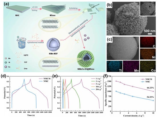 (a) Composite diagram of NMCM hollow spheres. (b) SEM graphs of NiMnCoOH@MXene (it is at the left corner on the top that the hollow structure of NiMnCoOH@MXene is demonstrated). (c) EDS elemental mapping of C, O, Ni, Co, Mn, and Ti in NiMnCoOH@MXene. (d) GCD diagrams for NiMnCoOH and NiMnCoOH@MXene (under optimum conditions) tested at 1 A g−1. (e) GCD diagrams of NiMnCoOH@MXene under various current densities. (f) Capacitance values in different current densities of NiMnCoOH and NiMnCoOH@MXene. Reproduced with permission [111]. Copyright 2024, Elsevier.