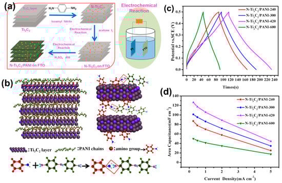 (a) Diagrammatic representation for the fabrication of N-Ti3C2/PANI. (b) Atomic schematic of intercalated PANI in the interlayers of N-Ti3C2. (c) Representative GCD curves on the condition of the current density being 0.5 mA cm−2. (d) Specific capacitance on the condition of various current densities from 0.25 to 5 mA cm−2. Reproduced with permission [114]. Copyright 2019, Elsevier.