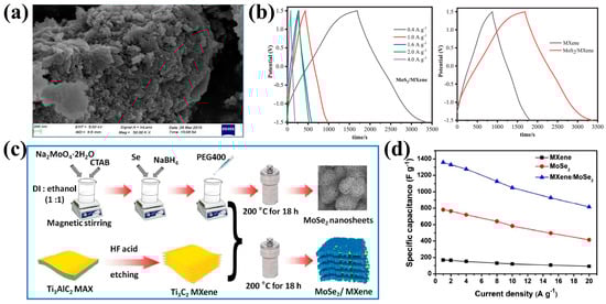 MXene materials have also been widely applied in capacitors through their combination with other 2D materials such as MoS2 [115] and MoSe2 [116,117]. Compared to traditional batteries, capacitors have a lower energy density, so improving their electrode materials is particularly important for enhancing their energy storage capacity. MXene materials have good conductivity and morphological characteristics, while MoS2 is a graphite-like material with a high ion conductivity and energy storage capacity. Combining these two materials allows for energy storage across a larger voltage range and an overall increase in capacitance. For instance, in their preparation of MoS2/MXene materials (Figure 10a), Chandran et al. improved MXene by etching it [118]. Through multiple characterizations, they discovered that this material exhibited a maximum specific capacitance of up to 342F g−1 across an extended voltage range (Figure 10b). However, the van der Waals forces between MXene layers can lead to their stacking and aggregation, causing a loss of electrochemically active sites. This issue can be addressed by using other 2D materials to enhance the construction of MXene-based electrodes, thereby producing supercapacitors with excellent electrochemical performance [115]. For example, Chen et al. introduced layered MoSe2 nanosheets into MXene (Figure 10c), creating a unique heterostructure with an enhanced active region for redox reactions that also exhibits good synergistic effects [119]. This composite material demonstrated a higher specific capacitance of 1358.5 F g−1 (Figure 10d), not only improving the energy density of the capacitor but also maintaining its high-power density and long cycling life. It is a promising candidate material for supercapacitors. In summary, research on the combination of MXene materials with other 2D materials provides a broader material design approach for developing supercapacitors with high-energy density and superior electrochemical performances [120]. It also offers an important scientific foundation for achieving sustainable energy conversion and storage.