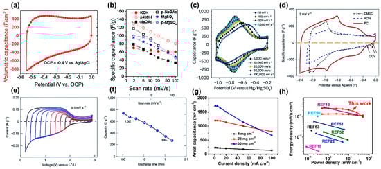 (a) Cyclic voltammetry (CV) curve of Ti3C2Tx paper in KOH electrolyte. (b) Rate performance of Ti3C2Tx paper (open symbols) versus multilayered exfoliated Ti3C2Tx electrodes (solid symbols) in various electrolytes. Reproduced with permission [90]. Copyright 2013, American Chemical Society. The American Association for the Advancement of Science. (c) Cyclic voltammetry data were collected at scan rates from 10 to 100,000 mV s−1 in 3 M H2SO4. Reproduced with permission [153]. Copyright 2017, Macmillan Publishers Limited, part of Springer Nature. (d) CV curves of a Ti3C2Tx electrode with 1 M LiTFSI in DMSO, can, and PC organic electrolytes. Reproduced with permission [154]. Copyright 2019, Springer Nature. (e) CV curves of the Ti3C2Tx electrode in 1 M LiPF6 (in 1:1 ethylene carbonate/dimethyl carbonate) electrolyte. (f) Ti3C2Tx electrode capacity versus discharge time from CV curves recorded at various potential scan rates. Reproduced with permission [83]. Copyright 2020, Springer Nature. (g) A summary of FT-SSSs areal capacitance under different charging/discharging current densities. (h) Ragone plot of FT-SSS in comparison to other state-of-the-art MXene-based SSSs. Reproduced with permission [155]. Copyright 2022, Elsevier.