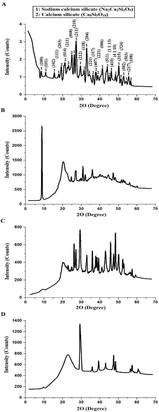 XRD analysis of the NaCaSilicate (A), CS (B), CS@NaCaSilicate (C), and CCS@NaCaSilicate (D) samples.