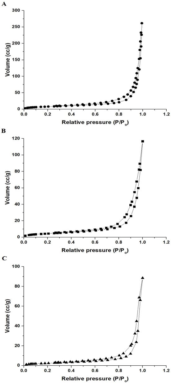 N2 adsorption–desorption isotherms of the NaCaSilicate (A), CS@NaCaSilicate (B), and CCS@NaCaSilicate (C) products.