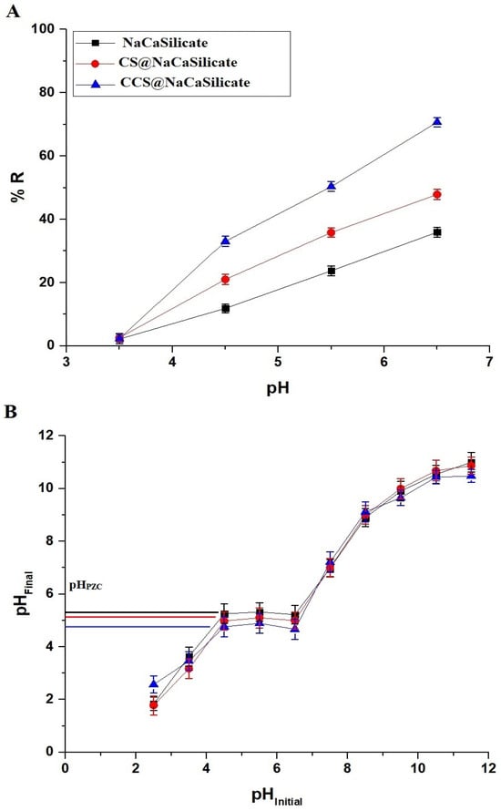The determination of the point of zero charge (pHPZC) for the fabricated adsorbents followed our prior research methodology [34,35]. In this approach, 100 mg of the NaCaSilicate, CS@NaCaSilicate, or CCS@NaCaSilicate adsorbent were introduced into 0.05 L of KCl solutions that had a chemical concentration of 0.03 M and varied in pH from 2.50 to 11.50. Subsequently, the adsorbents were isolated through centrifugation, and the final pH of the resulting filtrates was measured employing a CYBERSCAN 510 pH meter. Also, a relationship was identified between the preliminary values of pH (displayed on the x-axis) and the matching final values of pH (represented on the y-axis). The pH final value (on the y-axis) determines the zero-charge point, where the resulting curve shows near constancy.