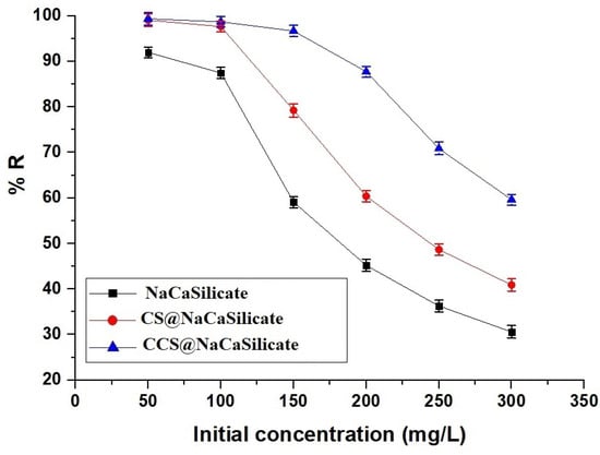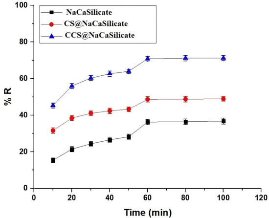 In Figure 7, the graph depicts the fluctuation in the removal percentage of Pb(II) ions concerning contact time. Also, the efficacy of the fabricated adsorbents is commonly dependent on the contact period of adsorption. A progression in adsorption time from 10 to 60 min correlates with an increase in the removal percentage of adsorbed Pb(II) ions. This augmentation is attributed to the heightened obtainability of free adsorption locations during this duration. On the contrary, the elimination process decelerates with an extension of time from 60 to 100 min as the free adsorption locations become saturated. The elimination percentages of Pb(II) ions using the NaCaSilicate, CS@NaCaSilicate, and CCS@NaCaSilicate samples after 60 min are 36.29, 48.66, and 70.86%, respectively.