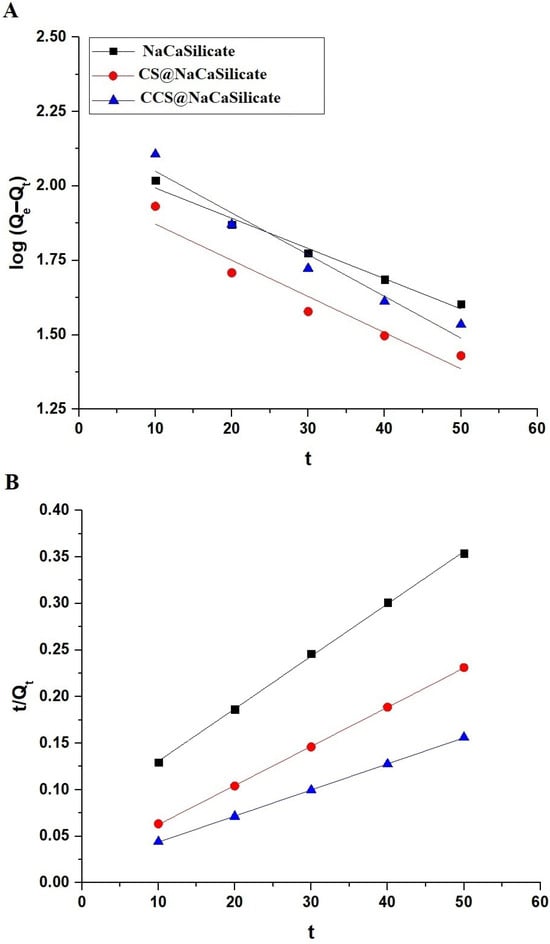 Figure 8A,B displays the application of the pseudo-second-order (Equation (3)) and pseudo-first-order (Equation (4)) kinetic models for evaluating the adsorption mechanism of Pb(II) ions onto the surface of the fabricated adsorbents [34,35].
