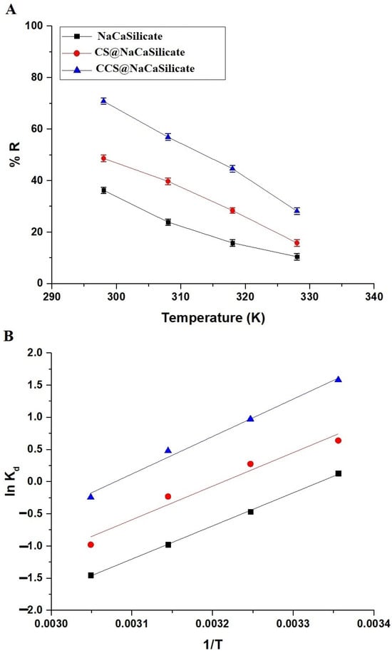 In evaluating viability, the assessment encompasses the analysis of thermodynamic constants, including entropy change (∆S), enthalpy change (∆H), and free energy (∆G). These parameters, along with the distribution coefficient (Kd) at four different temperatures, are computed employing Equations (5)–(7) [34,35].