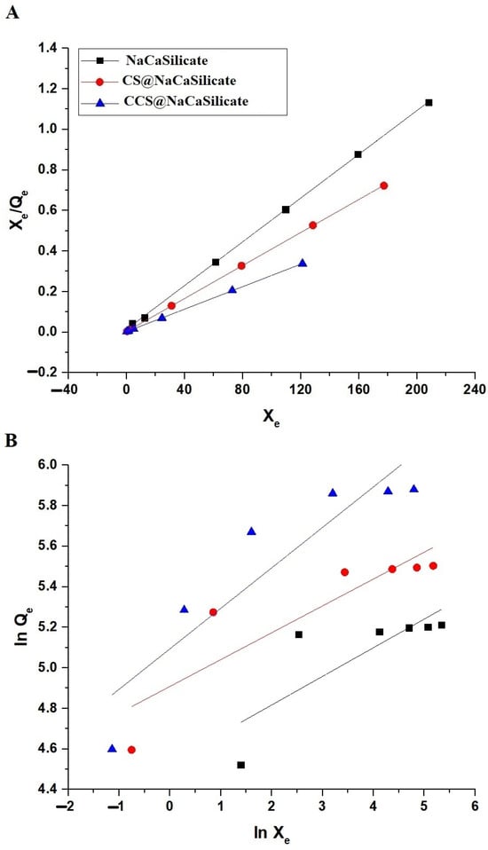 The plot of the Langmuir (A) as well as Freundlich (B) isotherms for the elimination of Pb(II) ions using the fabricated samples.