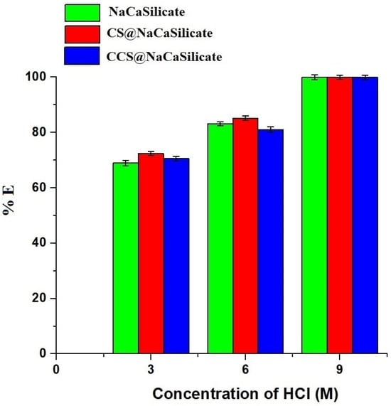 Desorption studies were conducted to assess the regenerative and reuse capabilities of the created adsorbents, using 50 mL of several hydrochloric acid concentrations (3, 6, and 9 M) as an eluting agent for Pb(II) ions, as elucidated in Figure 12. In addition, the desorption percentage (% E) of Pb(II) ions from the fabricated adsorbents was computed employing Equation (11) [34,35].
