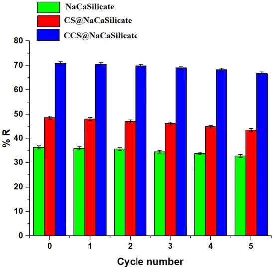 A total of 2.5 g of chitosan (CS) was dissolved in an acetic acid mixture (8.5 mL of CH3COOH:130 mL of distilled water) while being continuously stirred magnetically at ambient temperature for 6 h. Subsequently, 2.5 g of NaCaSilicate was charged to the previous CS solution under continuous magnetic stirring at room temperature for 6 h. This mixture was gradually incorporated into the NaOH solution (7.50 g of NaOH:300 mL of distilled water), again under continuous magnetic stirring at room temperature for 6 h. The resultant nanocomposite (CS@NaCaSilicate) was isolated, extensively washed several times with distilled water, and left to dry in the air.