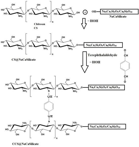2.5 g of chitosan (CS) was dissolved in an acetic acid mixture (8.5 mL of CH3COOH:130 mL of distilled water) while continuously stirred magnetically at ambient temperature for 6 h. Subsequently, 2.5 g of NaCaSilicate was charged to the previous CS solution under continuous magnetic stirring at room temperature for 6 h. A terephthalaldehyde solution (0.5 g of terephthalaldehyde dissolved in 50 mL of methanol) was also charged to the previous solution under continuous magnetic stirring at room temperature for 2 h. Additionally, this mixture was gradually incorporated into the NaOH solution (7.50 g of NaOH: 300 mL of distilled water), again under continuous magnetic stirring at room temperature for 6 h. The resultant nanocomposite (CCS@NaCaSilicate) was isolated, extensively washed several times with distilled water, and left to dry in the air. Scheme 1 shows the modification of nanostructures via chitosan and chitosan crosslinked with terephthalaldehyde. The nanostructures possess OH groups on their surface as a result of the hydrolysis of Ca-OH alongside Si-OH throughout the sol-gel fabrication of these nanostructures.