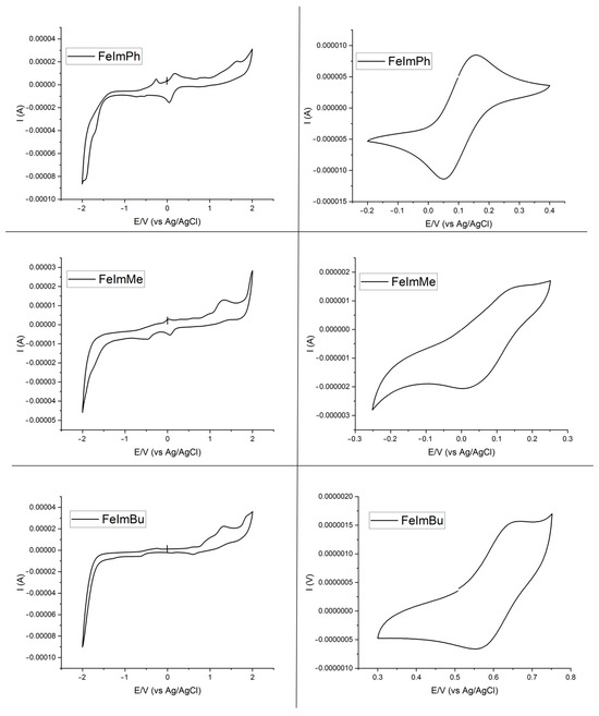 Cyclic voltammograms of complexes FeImPh, FeImMe, and FeImBu (0.1 M nBu4NPF6, 100 mVs−1, glassy carbon, Ag/AgCl, 25 °C) in CH2Cl2 at 1 × 10−4 M.