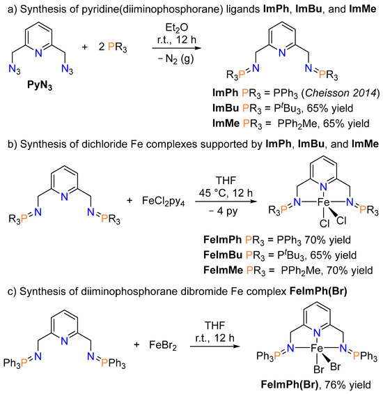 The N,N,N-pincer ligand bis(methyliminophosphoranyl)pyridine (ImPh, see Scheme 2a) is an ideal platform for stabilizing copper [20] and low-valent f elements [21,22]. In the case of copper, the coordination mode of ImPh depends on the oxidation state of the metal, with k3-N,N,N and k2-N,N coordination modes for Cu(II) and Cu(I) centers, respectively [20]. Due to the ease of synthesis of ImPh, which can be accessed from the corresponding organic diazide and triphenylphosphine, we hypothesized that other derivatives of this ligand scaffold could be obtained similarly using other phosphines. This would generate a set of ligands to modulate the electronic and steric properties of iron(II) pincer complexes. In addition, the potential of bis(iminophosphorane)pyridine ligands to exhibit hemilability could be advantageous for catalytic applications of the resulting iron complexes [20].