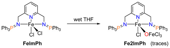 Efforts to obtain crystalline material for X-ray diffraction of the bis(iminophosphorane)pyridine complexes under dry and air-free conditions were unsuccessful. Instead, suitable monocrystals of the µ-O-bridged dinuclear iron complex Fe2ImPh were obtained from a cold solution of FeImPh in THF (Scheme 3).
