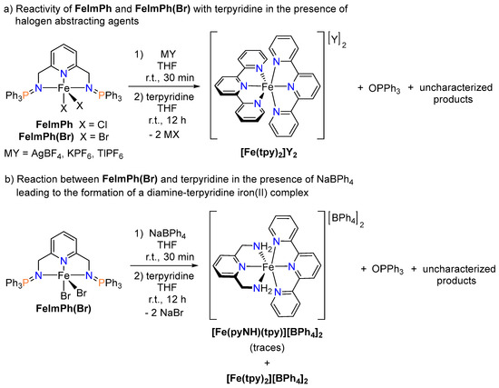 - Tannoux, T.; Mazaud, L.; Cheisson, T.; Casaretto, N.; Auffrant, A. Fe(II) complexes supported by an iminophosphorane ligand: Synthesis and reactivity. Dalton Trans. 2023, 52, 12010–12019. [Google Scholar] [CrossRef] [PubMed]