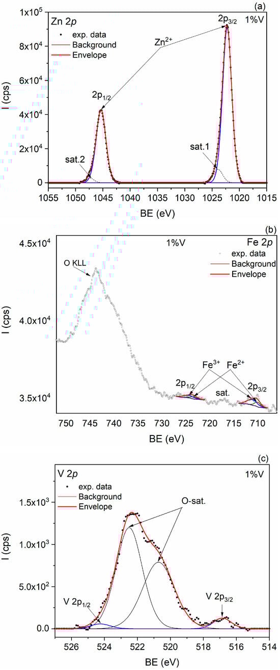 The Fe 2p core-level line deconvolution, corresponding to sample 1% V, is shown in Figure 6b. One can see the Fe3O4 model was applied with the peaks Fe2+ 2p3/2 positioned at 710 eV and Fe3+ 2p3/2 positioned at 711.3 eV. Due to the Mg anode X-ray source the O KLL line is also present in the spectrum. The obtained surface atomic ratio Fe/Zn is 0.08.