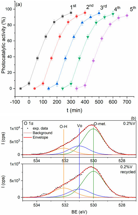 It can be observed by increasing the V doping degree, the apparent kinetic constant increases from 1.5 × 10−3 min−1 (for Fe3O4-ZnO:V 0%) to 10.3 × 10−3 min−1 (for Fe3O4-ZnO:V 1%). These results sustained the conclusion that Fe3O4-ZnO:V 1% sample had the best photocatalytic activity. Based on the XPS results, these assumptions support V doping increases Vo.