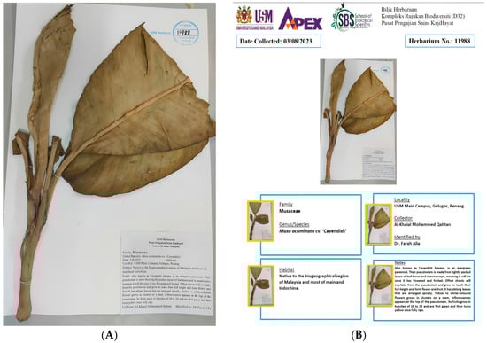 Figure 1. Herbarium information: (A) banana dry leave; (B) herbarium no. and report.