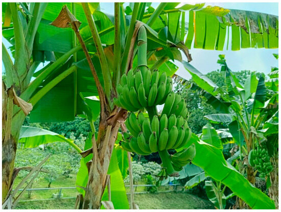 The species of banana fruits in this work belongs to Musa Acumniata CV. (Cavendish). The reported species was under herbarium number 11988, as presented in Figure 1A,B. The banana peels were collected from the plant shown in Figure 2 below at the USM main campus.