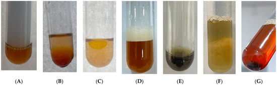 Figure 3. Extract screening tests: (A) flavonoids test; (B) glycosides test; (C) emulsion test; (D) froth test; (E) ferric chloride test; (F) lead acetate test; (G) phlobatannins test.
