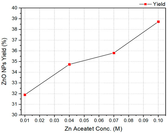 The yield of ZnO NPs ranged from 31.89 ± 0.72% to 38.72 ± 1.56% in direct proportion with the concentration of Zn acetate, as presented in Table 3. These results agree with the reported findings of Wang and co-workers [30].