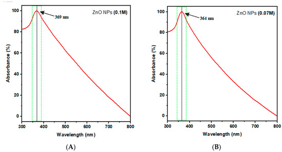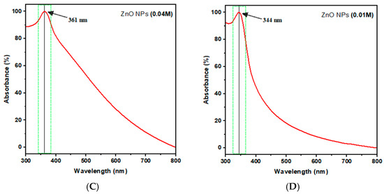 In terms of the UV–visible absorption spectrum of biosynthesized ZnO nanoparticles using BPE with Zn precursor concentrations ranging from 0.01 M to 0.1 M, as shown in Figure 5A, a strong absorption band between 300 and 550 nm is known to be presented by ZnO NPs [31]. Due to the ZnO nanoparticles’ surface plasmon resonance (SPR) property, they exhibit a characteristic peak in the range of 300 to 370 nm, indicating nanoparticle electron vibration with the light wave [31]. The position of ZnO nanoparticles’ SPR is influenced by both their shape and size. In particular, the size of the synthesized nanoparticles is directly proportional to the absorbed wavelength by ZnO nanoparticles. Larger nanoparticles exhibit a high absorption wavelength, while smaller nanoparticles exhibit a lower wavelength [32]. The spectra reveal that the absorbance wavelength decreases with decreased Zn precursor concentration at a fixed quantity of BPE, as observed for the peak of the lowest Zn precursor concentration (0.01 M). There are distinct peaks around 370–340 nm for ZnO NP samples. The peak at 344 nm shows a blue shift in the 0.01 M sample in Figure 5D compared to other samples (0.1 M, 0.07 M, and 0.04 M), which have peaks at 369, 364, and 361 nm, respectively, in Figure 5A–C. The peak of the 0.01 M sample becomes narrower and sharper than others, suggesting more particle production and the promotion of the formation of smaller nanoparticles. As illustrated, the SPR band ranging around 340–370 nm confirms ZnO nanoparticle formation, in agreement with previously reported results [33,34]. The ZnO NP band gaps are calculated from the wavelength of the maximum peak absorbance according to Equation (2), as illustrated in Table 3.