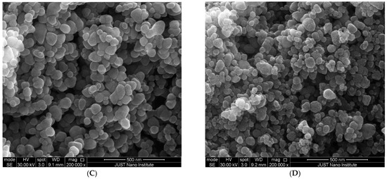 Figure 6. SEM images of the prepared ZnO NPs powder. (A) ZnO NPs (0.1 M); (B) ZnO NPs (0.07 M); (C) ZnO NPs (0.04 M); (D) ZnO NPs (0.01 M).