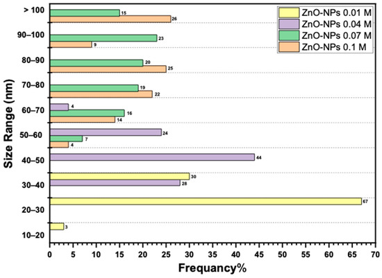 The influence of different concentrations of Zn acetate solution (0.01 M, 0.04 M, 0.07 M, and 0.1 M) and BPE on the shape and size of ZnO NPs during the biosynthesis process is studied. The results indicate that when the Zn acetate concentration increased from 0.01 M to 0.1 M, the particle size decreased from 89 ± 22 nm to 27 ± 4 nm, as tabulated in Table 3. SEM images in Figure 6 show that the largest nanoparticles are formed with the highest concentration of Zn acetate. The biosynthesized ZnO NPs have a rod-like structure, as seen in Figure 6A, and a hexagonal structure, as seen in Figure 6B–D. NP size frequency percentages for each sample were counted by using image J software 1.53t. from SEM images, as shown in Figure 7. In the presence of fixed amounts of BPE, the size increased as the Zn acetate concentration increased due to the competition between Zn ions and functional groups of BPE phytochemicals. Higher percussor concentrations form large anisotropic particles, and these findings agree with the findings of Mohammadi and Ghasemi in 2018 [31]. Large particle sizes are produced upon increasing the Zn acetate concentration because of metal ion availability, resulting in the aggregation and agglomeration of NPs with higher precursor concentrations [35]. Thus, 0.01 M of Zn acetate is the optimum concentration for the green synthesis of ZnO nanoparticles using BPE.