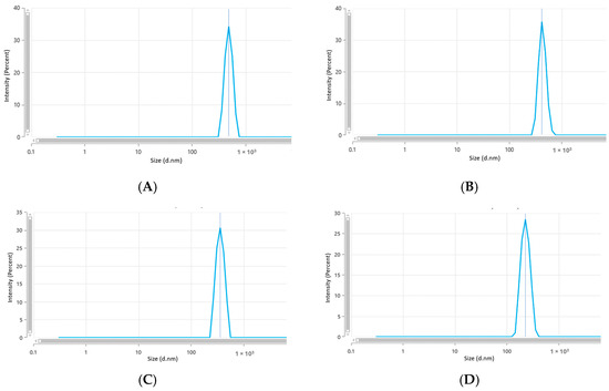 Figure 8. Size distribution of the prepared ZnO NPs. (A) ZnO NPs (0.1 M); (B) ZnO NPs (0.07 M); (C) ZnO NPs (0.04 M); (D) ZnO NPs (0.01 M).