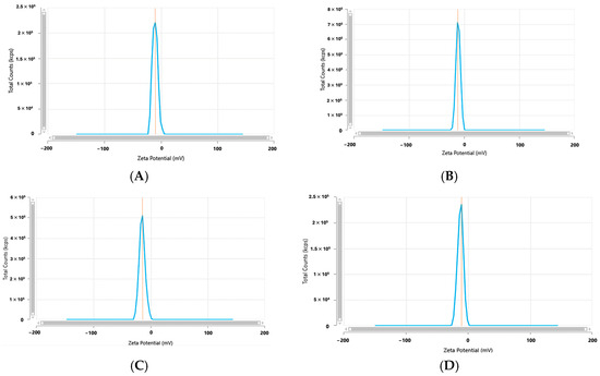 Figure 9. Zeta potential distribution of the prepared ZnO NPs. (A) ZnO NPs (0.1 M); (B) ZnO NPs (0.07 M); (C) ZnO NPs (0.04 M); (D) ZnO NPs (0.01 M).