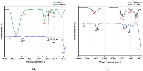 Figure 10. (A) ATR-FTIR spectra of BPE and ZnO NPs; (B) ATR-FTIR spectra of Zn acetate and ZnO NPs.