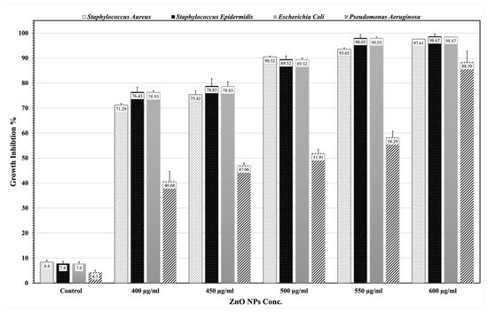 Based on the optimized characteristics of ZnO nanoparticles, sample (D) (0.01 M ZnO NPs) was selected to test the rate of growth inhibition against E. coli ATCC no. 25922, P. aeruginosa ATCC no. 27853, S. aureus ATCC no. 25913, and S. epidermidis ATCC no. 12228. MIC and MBC were determined. Figure 12 shows the growth inhibition rate of bacterial growth in the presence of ZnO NPs compared with the growth rate in the absence of ZnO NPs. According to Equation (3), the results of growth inhibition show that the highest antibacterial effect of ZnO-NPs was against S. epidermidis (98.6 ± 0.9%), while the lowest effect was against P. aeruginosa 88.4 ± 4.4%. The MIC of ZnO NPs was at 500 µg.mL−1, with a growth inhibition of 90.5 ± 1.4% and 89.5 ± 1.32% against S. aureus and S. epidermidis, respectively. Furthermore, the MIC was at 500 µg.mL−1 with 79.11 ± 1.69% growth inhibition against E. coli and 600 µg.mL−1 against P. aeruginosa with a growth inhibition of 88.4 ± 4.4%. The synthesized ZnO NPs were effective against all tested bacterial strains with different MIC levels, depending on the type of bacteria. Table 5 presents the MIC and MBC of ZnO NPs against tested bacterial strains, indicating that the bactericidal action of ZnO NPs against S. aureus and S. epidermidis was at 500 µg.mL−1. There is no bactericidal action of ZnO NPs against both E. coli and P. aeruginosa.
