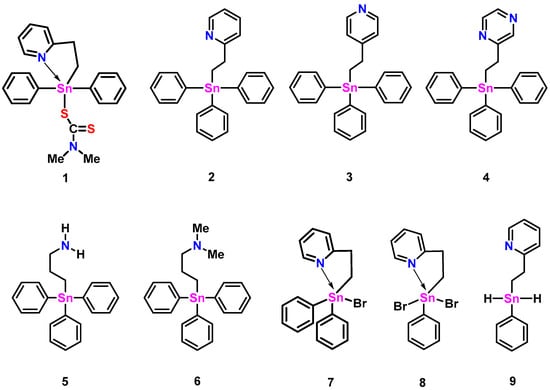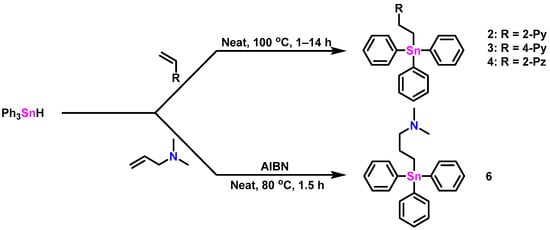 - Mahon, M.F.; Molloy, K.C.; Waterfield, P.C. Synthesis, Characterization, and Reaction Chemistry of [2-(2-Pyridyl)Ethyl]-, [2-(4-Pyridyl)Ethyl]-, and [2-(2-Oxo-4-Pyrrolidinyl)Ethyl]Triphenyltin(IV). Organometallics 1993, 12, 769–774. [Google Scholar] [CrossRef]