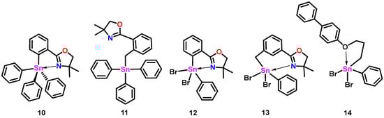 By comparison, the 119Sn NMR resonance of 8 is significantly downfield of the signals observed for oxazoline-containing dibromides (e.g., 12: 119Sn δ = −290.6 ppm, 13: 119Sn δ = −248.2 ppm), which may reflect the increased Lewis basic character of these ligands with Sn centers in solution [16]. Evidence of 5-coordinate geometries in 8, 12, and 13 in solution is also inferred from the 119Sn NMR resonance for 14 (Table 1: 119Sn δ = −53.3 ppm) [14], which displays 5-coordinate geometry at Sn in the solid state but is likely 4-coordinate in solution.