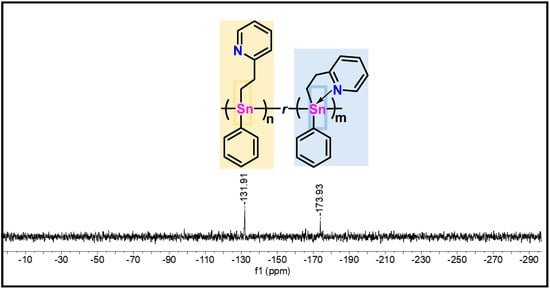 119Sn NMR (C6D6) analysis of polymer 15 prepared with 4 mol% of catalyst (Figure 4) reveals the appearance of two Sn environments in what may be described as an “open” and “closed” conformation (δ = −132 and −173 ppm, respectively). Hypercoordinate interactions of ≈30–40% of the nitrogen atoms of the pyridyl moiety with the proximate Sn centers resulted in an upfield chemical shift (≈40 ppm) relative to the 4-coordinate Sn centers. Similar behavior has been previously observed in other polystannanes bearing secondary potential metal-binding ligand groups [16,19,21,30]. To confirm that both resonances are indeed a result of an “open” and “closed” confirmation around the Sn center, a few drops of d8-THF were added to the NMR sample, as previously demonstrated by Pau et al. for other hypercoordinate polystannanes [30]. The coordination of THF to the Sn center displaces the hypercoordinate ligand and results in a single “open” 119Sn signal at δ = −132 ppm (Figure S34).